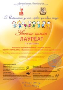 По результатам конкурса хору гимназии «Золотой росток» присуждено звание лауреата 2 степени XI Всероссийского конкурса «Звонкие голоса». От всей души поздравляем с новым достижением ребят, Екатерину Сергеевну, а также концертмейстера Зарипову Анну Викторовну!