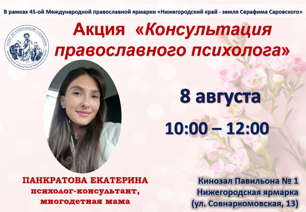 8 августа в кинозале первого павильона Нижегородской ярмарки в рамках 45-ой международной православной ярмарки «Нижегородский край — земля Серафима Саровского» отдел Нижегородской епархии по взаимодействию с медицинскими и социальными учреждениями проведет благотворительную акцию «Консультация православного психолога».