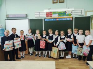 На 25 сентября отправлена первая партия подарков. Шефами в сентябре стали 1 «А» и 1 «Б» классы. Ребята и родители подошли к делу ответственно и с душой. Было собрано большое количество подарков. Также в больницу были переданы открытки с добрыми, вдохновляющими, поддерживающими пожеланиями от гимназистов.