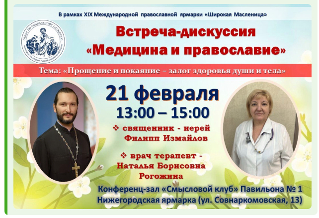 21 февраля в конференц-зале «Смысловой клуб» первого павильона Нижегородской ярмарки в рамках XIX международной православной ярмарки «Широкая Масленица» отдел Нижегородской епархии по взаимодействию с медицинскими и социальными учреждениями проведет встречу-дискуссию «Медицина и Православие» на тему «Прощение и покаяние – залог здоровья души и тела».