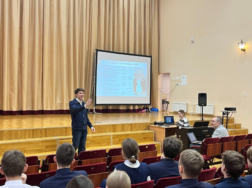 Учащиеся 9-11 классов узнали о жизни университета из первых рук. Об университете, факультетах, направлениях обучения, внеучебной жизни ребятам рассказал Хамидулин Артём Маратович — заместитель декана факультета гуманитарных наук по воспитательной работе, доцент, кандидат философских наук, кандидат богословия.