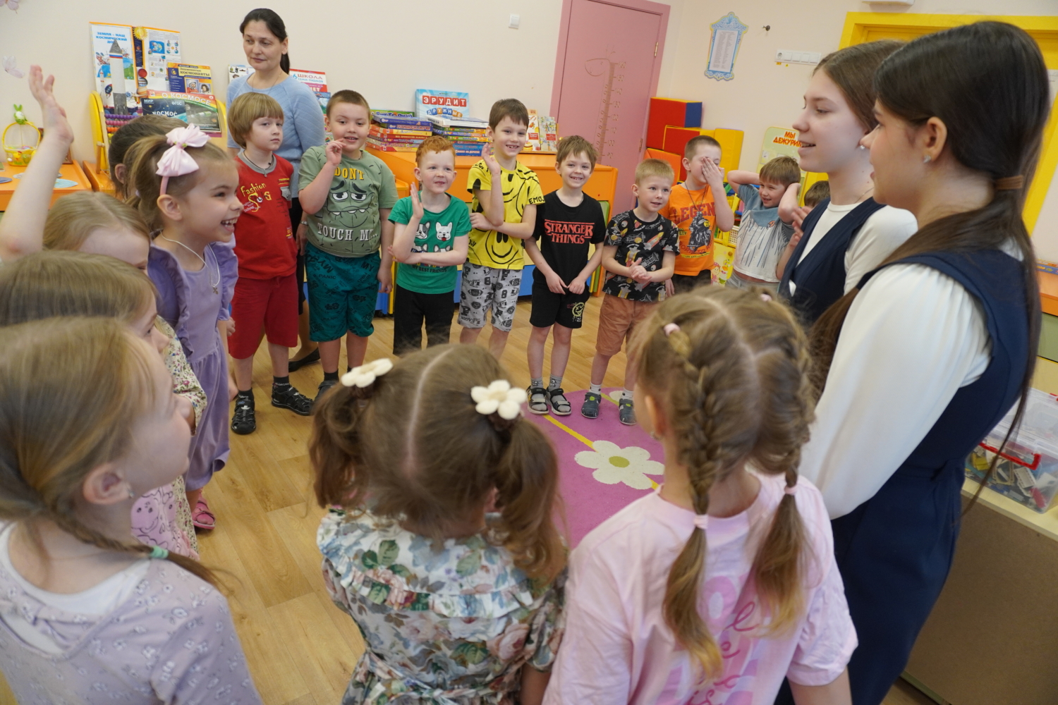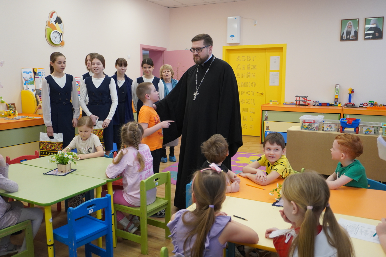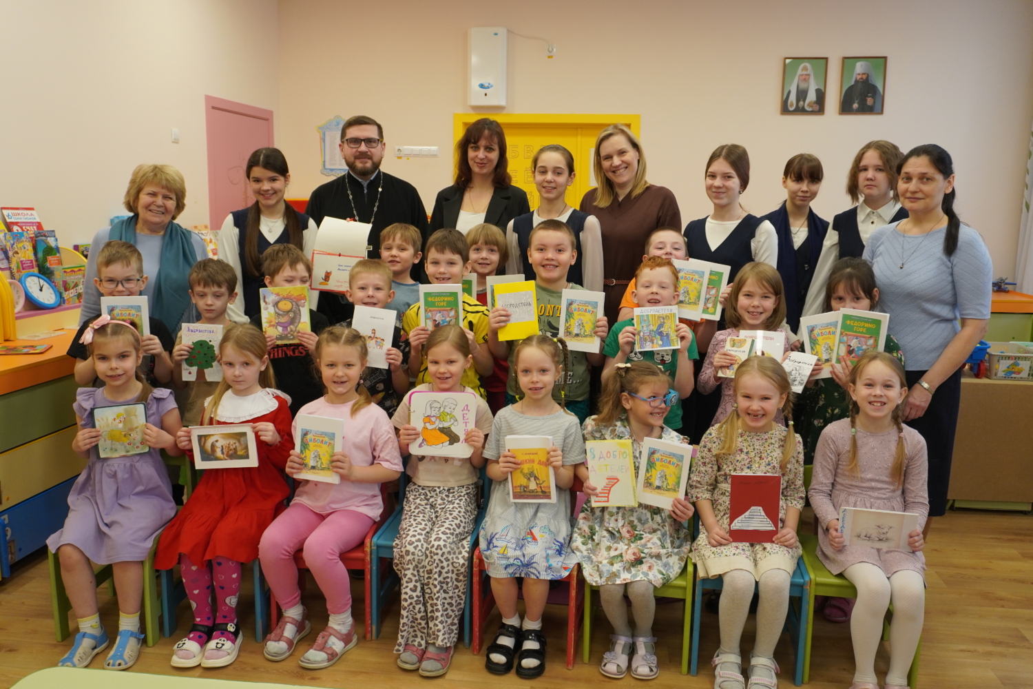 Дошкольники с радостью делились с гостями своими любимыми играми, рассказывали о распорядке дня и делились планами на будущее. Отец Илия пообщался с детьми и педагогами, а библиотекарь Валентина Владимировна провела беседу о важности любви, милосердия и добрых поступков. Ученицы 7 класса вручили малышам книжки и поиграли с ними в весёлые игры.
