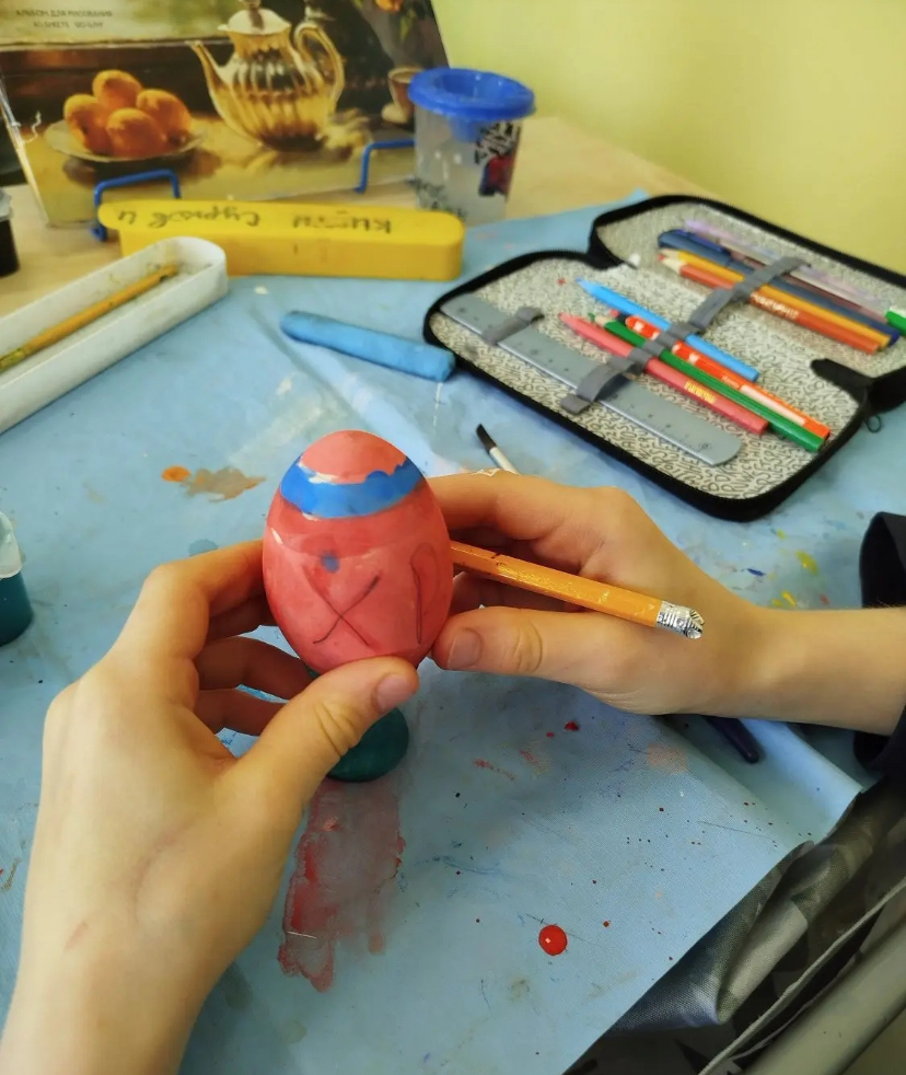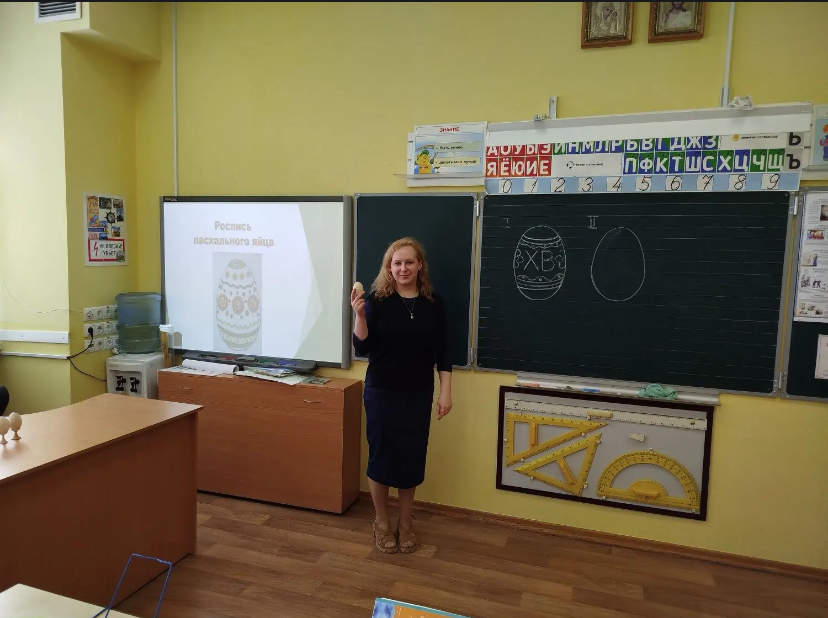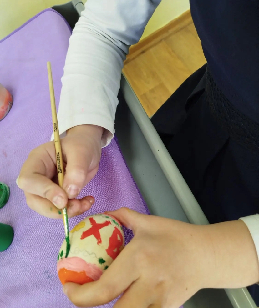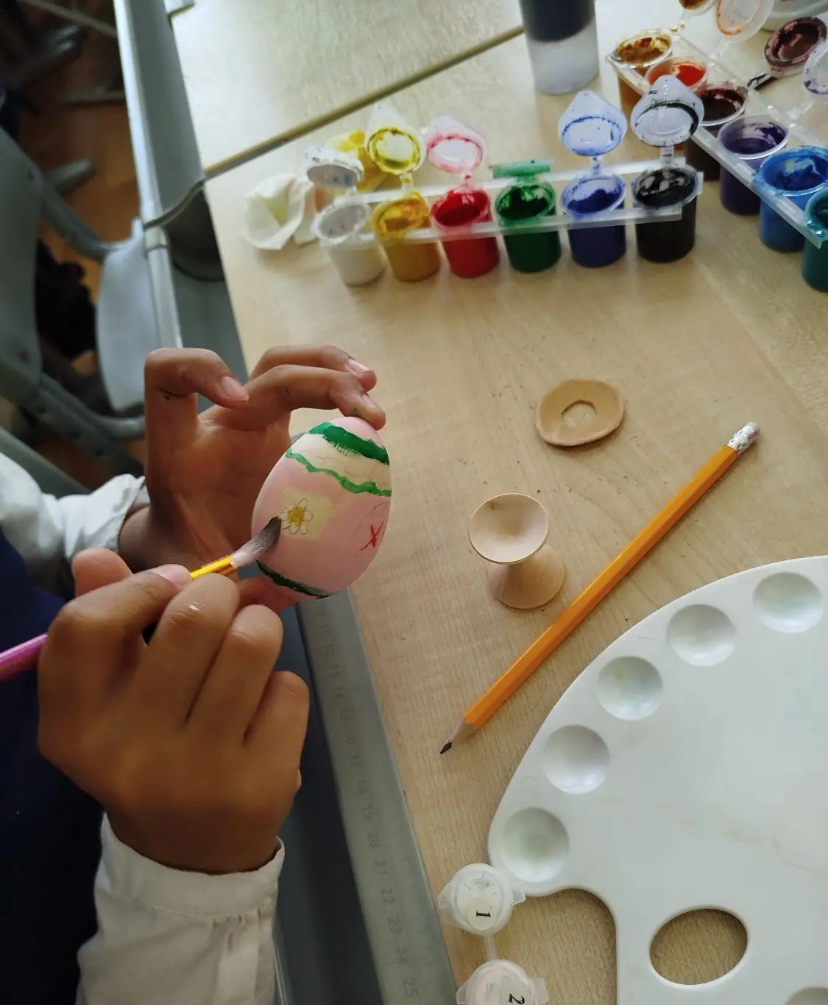 В рамках подготовки к светлому Христову Воскресению ребята под руководством учителя рисования Нины Владимировны Лисиной и классного руководителя Сергея Викторовича Никитина повторили технику выполнения узора в полосе и раскрасили деревянные яйца растительным орнаментом, а также вспомнили, почему именно яйцо стало главным символом Пасхи.